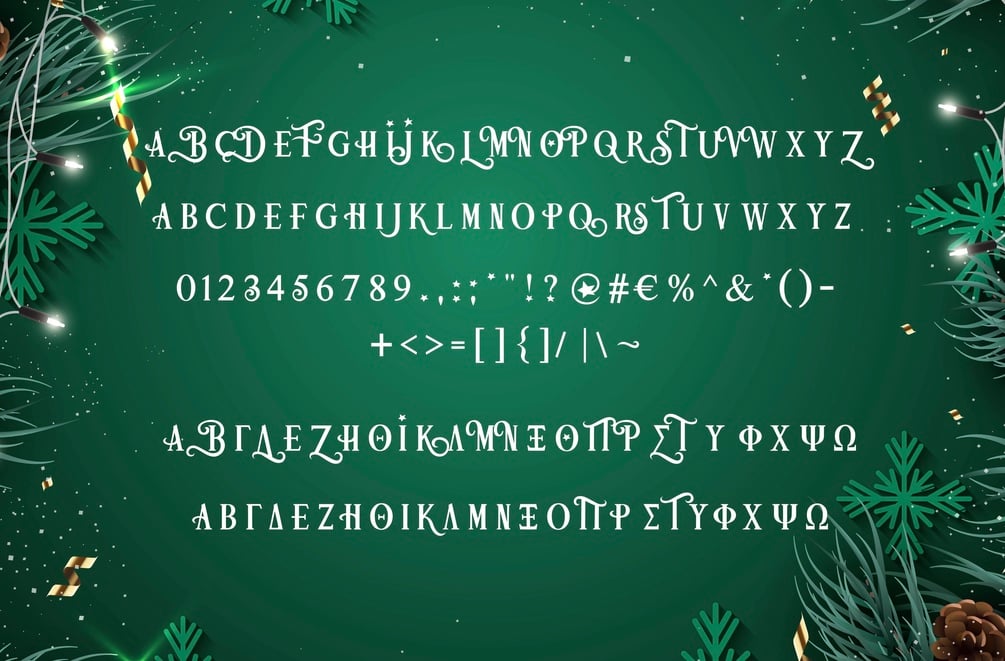 A festive font cause it’s this time of the year again! Includes uppercase, lowercase, numbers, special characters and Greek.